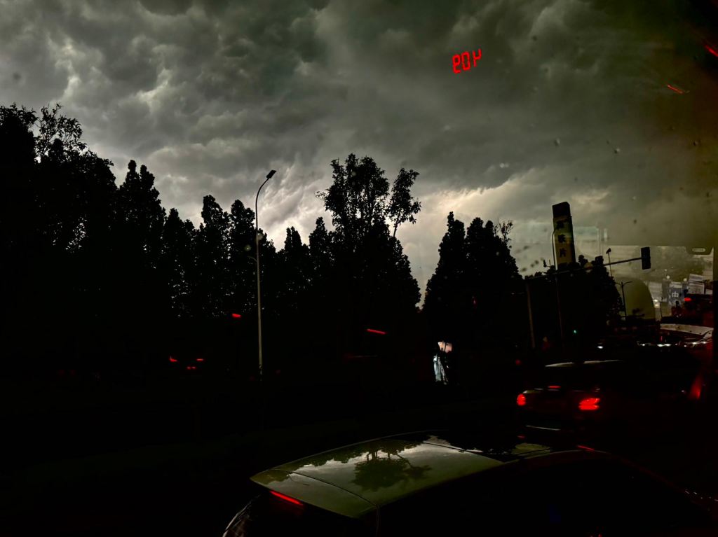 只見在石家莊的高樓大廈後面的天空,完全是墨黑一片,地面上開始刮起了強風,真的是風沙滾滾、車動人搖。不久大雨如同從天空傾倒而下一般地下著。一看時間不過下午四點,但是所有路上的車燈都亮了起來,因為四周如同黑夜一般。這雨真是相當的大,後來聽本地的同學說不但下雨了,而且還下了很大的冰雹。我們不禁有點擔心晚上能夠來的同學會比較少。