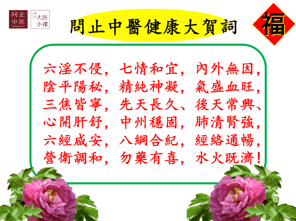 還記得過年的時候曾經和大家講了問止中醫健康大賀詞嗎? 這是我平常在祝福人家的時候常用的賀詞,這是根據我們中醫基礎理論而整理出來的,如果你能完全合乎這個賀詞裡面的描述,那你真是一個身心健康、無病無憂的一個人,長命百歲指日可待!