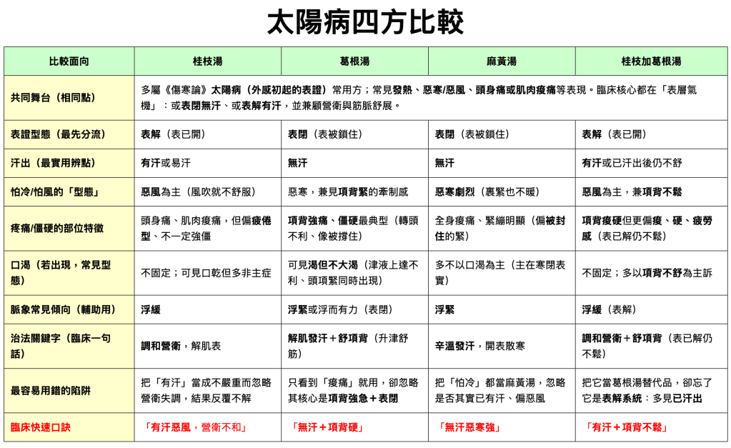 這也是太陽病最迷人、也最實用的地方——它不是在背方名,而是在看身體如何應對外邪。 上面有這麼多思路的敘述,我還是把它製作了以下這個表,讓大家可以一目了然地去掌握。