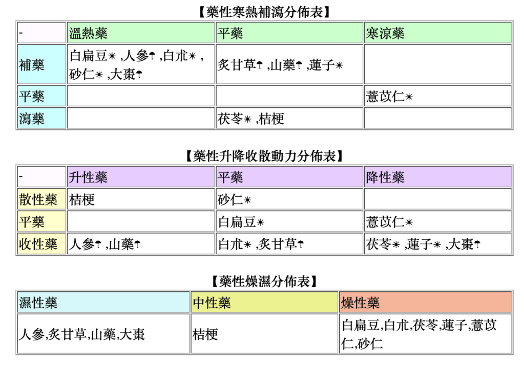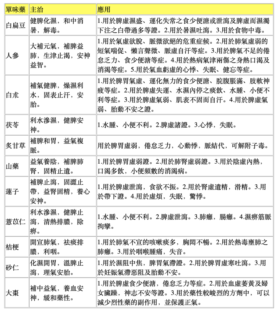 我們先來復習一下經方中有關「健脾」的方劑(我整理成表格。這樣比較容易掌握)。事實上這也是參苓白朮散的各種治則的原始來源: