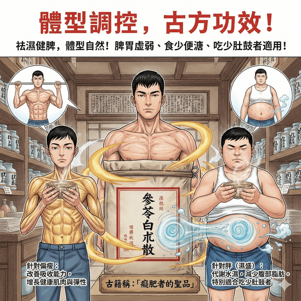 更有趣的是,這個方子還具有某種「體型調節」的特點。對於體質偏瘦的人,它可以改善吸收能力,使身體逐漸長出健康的肌肉與彈性;而對於因脾虛濕盛而肥胖的人,它又能幫助代謝水濕,減少腹部脂肪。因此古人甚至把它稱為「癡肥者的聖品」,特別適合那些明明吃得不算太多,但肚子卻總是鼓鼓的人。