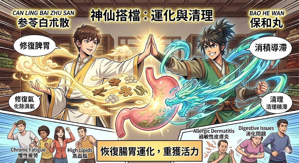 在實際運用中,許多醫家還會把參苓白朮散與另一個著名方劑——保和丸搭配使用。這兩個方子就像一對合作默契十足的搭檔。參苓白朮散負責修復脾胃、化除濕氣,而保和丸則專門處理飲食積滯、幫助消化。兩者合用時,一方面能恢復腸胃的運化能力,另一方面又能清理積存在腸胃中的食物停滯與代謝廢物。對於現代人因飲食不節、暴飲暴食所導致的慢性疲勞、高血脂、過敏性皮膚炎或各種消化問題,往往能發揮相當好的調理效果。