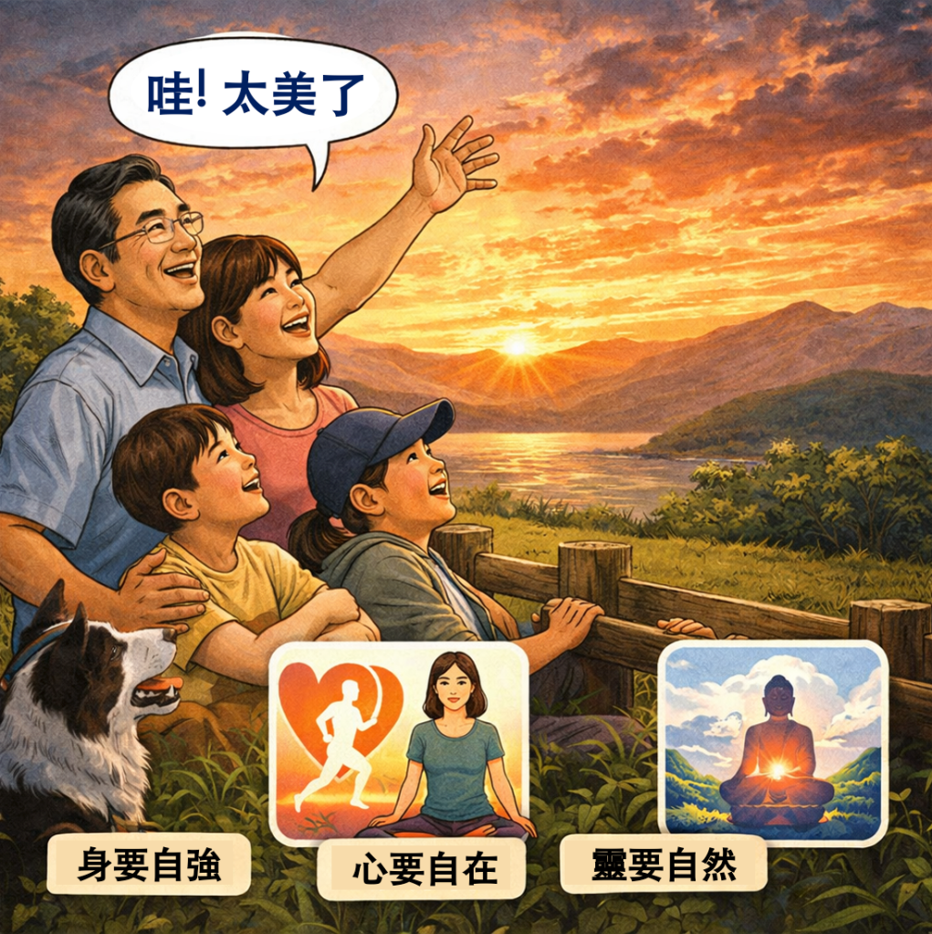 講到最後,我想送大家三句話,作為這一系列分享的一個總結。第一句是「身要自強」,也就是說身體的健康,不能完全依賴醫生,你自己要學會照顧自己,了解自己的身體,就像你買了一台很貴的機器,總要看說明書一樣。第二句是「心要自在」,面對各種境界,不要輕易被情緒牽動,不要動不動就恐懼、焦慮或憤怒,這些都是在消耗你的生命力。第三句是「靈要自然」,這是比較高一個層次的境界,就是讓自己的生命與自然規律相合,該怎麼樣就怎麼樣,不強求、不扭曲,讓身心靈慢慢回到一種和諧的狀態。這三句話都有一個共同的字——「自」。因為真正能改變你的人,不是醫生,不是神佛,而是你自己。正如佛家所說:「諸惡莫作,眾善奉行,自淨其意。」最後那句最關鍵——自淨其意,是靠你自己。