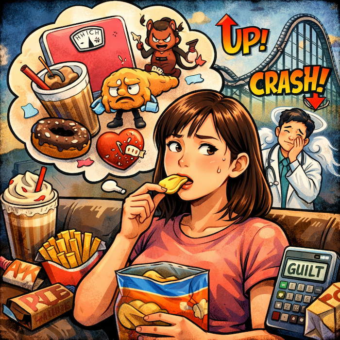 從現代醫學的角度來看,加工食品通常伴隨著高糖、高鹽、不良脂肪以及各種添加物,這些東西會讓血糖快速波動、刺激胰島素大量分泌,長期下來容易造成胰島素阻抗與慢性發炎。更關鍵的是,這些食品往往缺乏纖維與微量營養素,導致腸道菌群失衡,進一步影響免疫與情緒。而從中醫的角度來看,這些高度加工的「食品」,本質上就是一種容易「生濕、生痰、阻滯氣機」的來源。你會發現,中西醫兩種醫學體系雖然語言不同,但都在指出同一件事:這些東西讓身體變得不順。