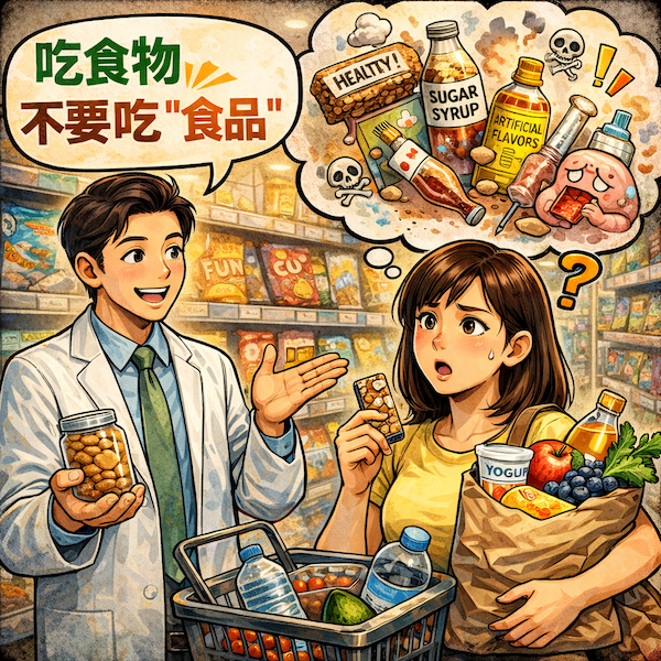 這句話乍聽之下有點像繞口令,但其實是現代營養學與中醫養生觀點的一個高度共識。所謂「食物」,指的是接近自然原型、加工極少的東西,例如堅果就是堅果、地瓜就是地瓜、蘋果就是蘋果;而「食品」,則是經過多重加工、調味、添加物修飾之後的產物,例如洋芋片、含糖優格、能量棒、果汁飲料等等。這兩者最大的差別,不只是名稱,而是對身體的影響機制完全不同。食物進入體內,身體知道怎麼處理;食品進入體內,身體往往需要「猜」它是什麼,甚至要付出額外代謝成本。