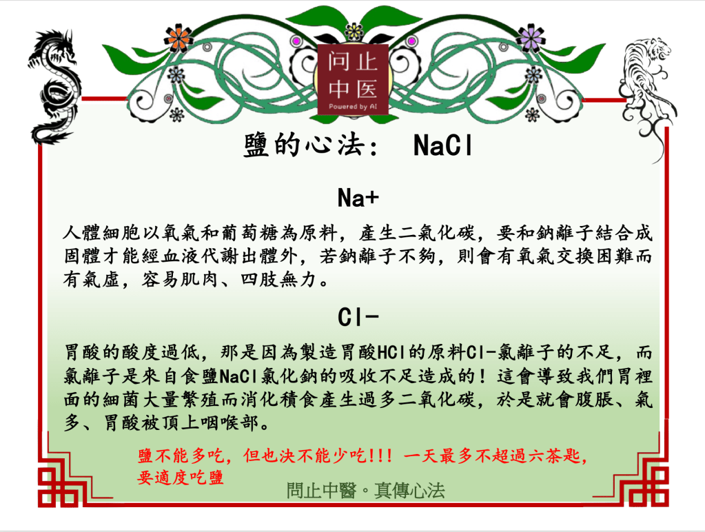 可是,中醫看事情向來不喜歡走極端。 我們最怕的不是鹽,而是「不辨證」。鹽不是絕對好,也不是絕對壞。它就像一把菜刀:拿來切菜很好,拿來亂揮就危險。真正重要的不是「吃不吃鹽」,而是:誰吃?什麼時候吃?吃多少?身體有沒有能力把它運化出去?